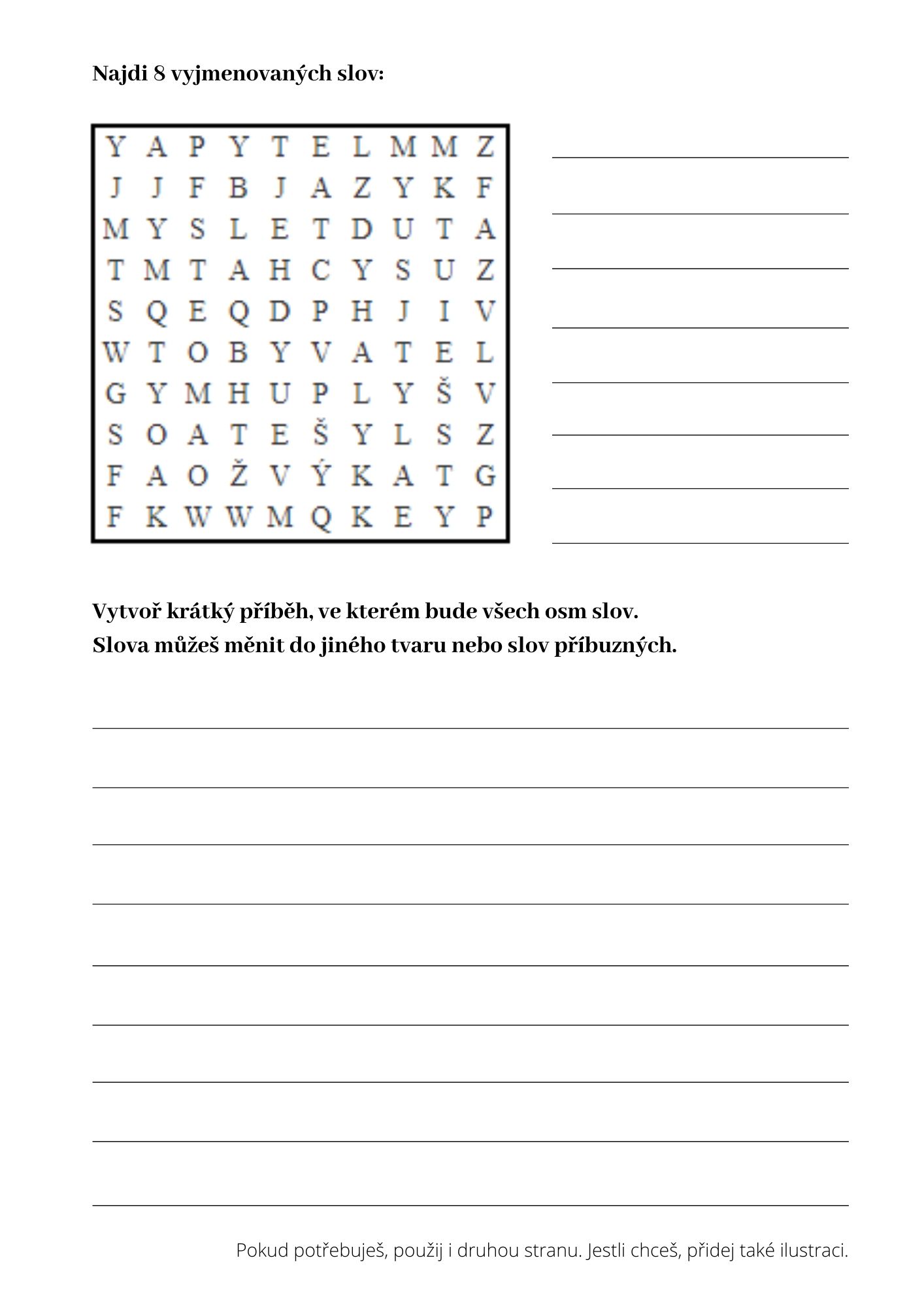 Zkuste úkol ještě vylepšit. Vytvořte krátký příběh, ve kterém bude všech osm slov. Slova můžete měnit do jiného tvaru nebo slov příbuzných.