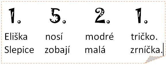 POZOR, všechny věty ale musí být složené takto: 1. 5. 2. 1. (to jsou čísla slovních druhů).